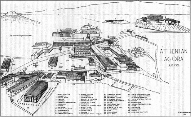 | Центральная площадь | Главная площадь, окруженная постройками | Недалеко от центра акрополя | Место собраний, форум, продажи |